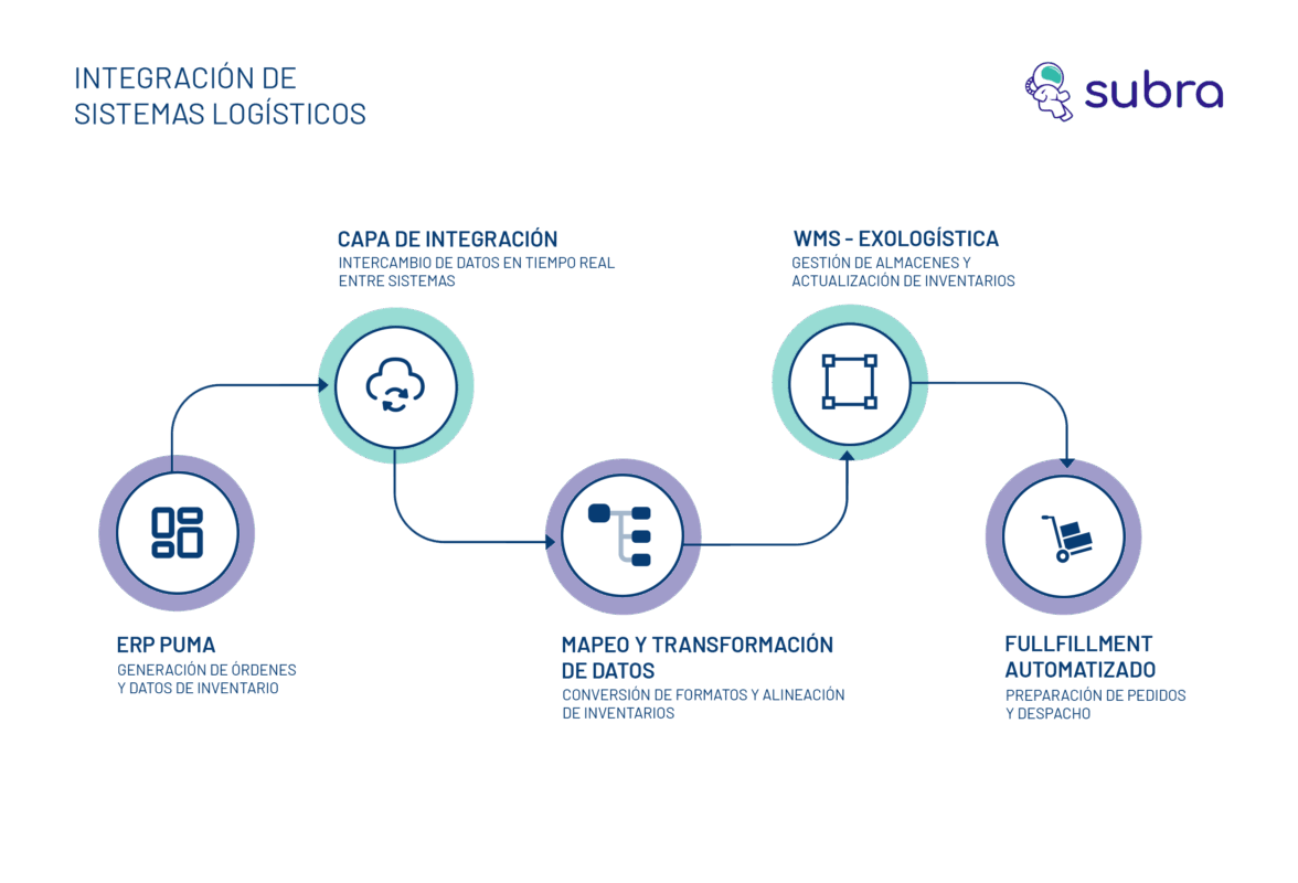 Al incorporar a PUMA Argentina como cliente, Exologistica enfrentó el desafío de gestionar operaciones de fulfillment similares a las actuales soluciones de comercio electrónico. Esto implicaba la necesidad de sincronizar constantemente los sistemas de PUMA y Exologistica para reflejar con precisión los niveles de stock, coordinar movimientos entre depósitos y procesar órdenes de venta generadas en el sistema de PUMA. La complejidad radicaba en integrar el ERP de PUMA con el Sistema de Gestión de Almacenes (WMS) de Exologistica para garantizar una operación eficiente y sin errores.