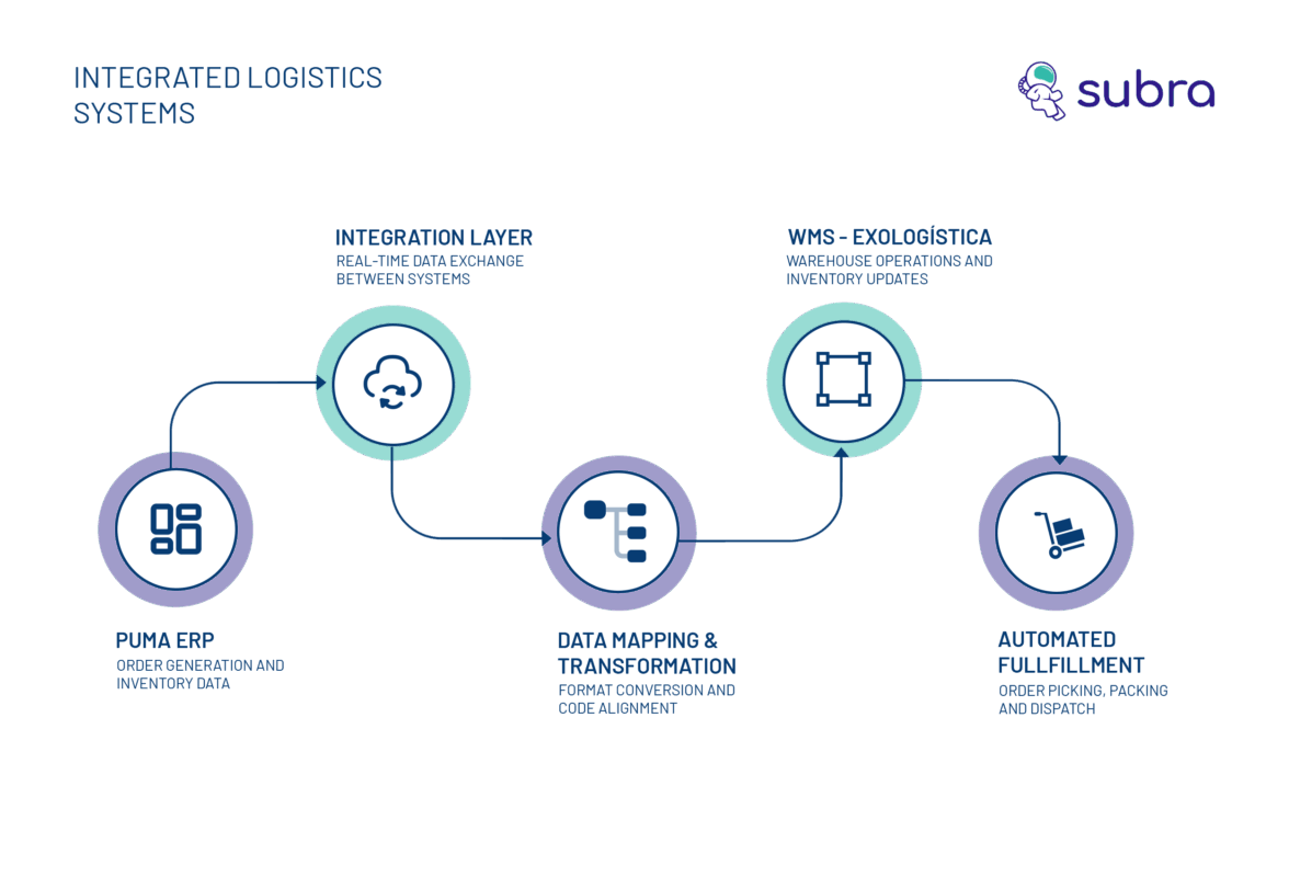 Upon onboarding PUMA Argentina as a client, Exologistica faced the challenge of managing fulfillment operations similar to modern e-commerce solutions. This required constant synchronization between PUMA’s and Exologistica’s systems to accurately reflect stock levels, coordinate warehouse transfers, and process sales orders generated in PUMA’s system. The complexity lay in integrating PUMA’s ERP with Exologistica’s Warehouse Management System (WMS) to ensure an efficient, error-free operation.